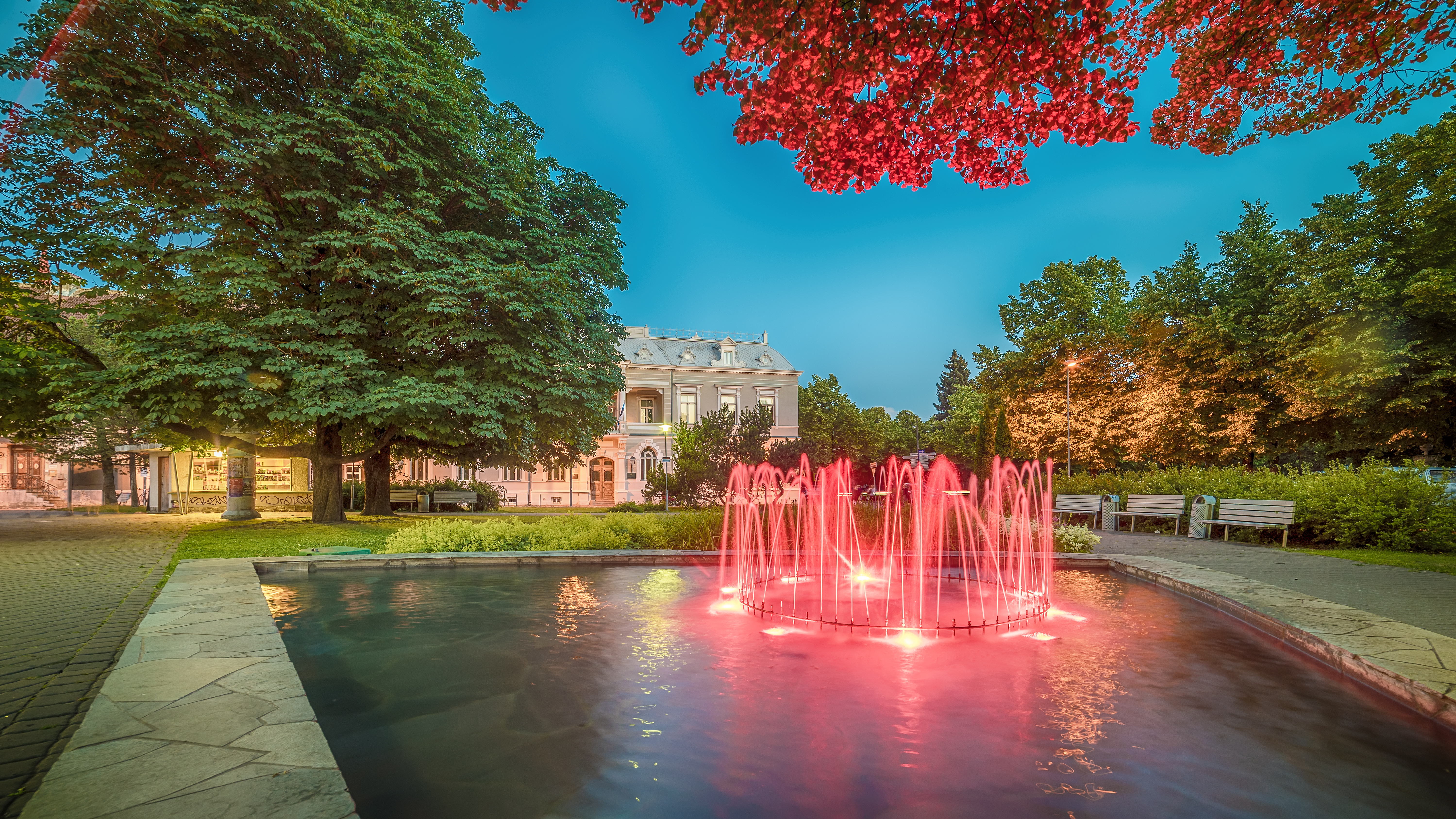A large, historic building with a prominent spire and red-tiled roof sits beside a river, framed by trees. The sky behind showcases a vibrant sunset with orange and blue hues.