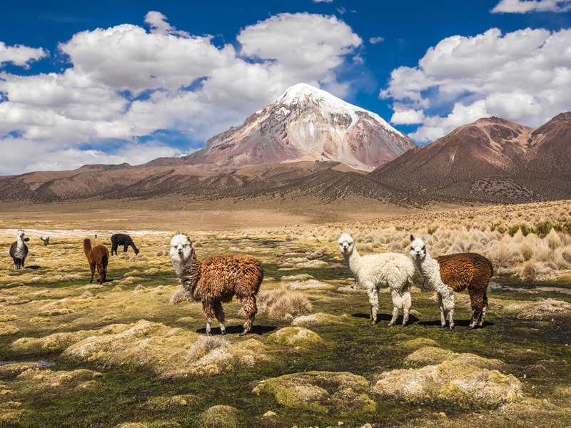 But aside from the usual highlights – why not visit bright red and green lakes, filled with colour-enhancing minerals and home to thousands of flamingos? Or walk among boiling, bubbling mud-pools, and visit a cemetery for burnt-out trains? If volcanoes are more your thing, head to the Sajama National Park, where the cone of Sajama looms over the savage landscape. Here, ancient burial towers pop up out of the floor as if from nowhere.